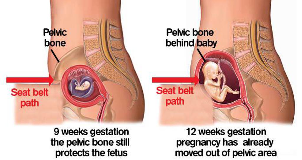The challenge for pregnant women is two-fold. First, at least some of that restraining force is being transferred to the baby. Secondly, as the pregnancy develops, it comes out in front of the pelvic bones, where the seat belt is meant to engage. At 9 weeks, the pregnancy is still well within the protection of the pelvic bone. But already at 12 weeks, it starts to move out in front of the pelvic bone, as shown in the picture.