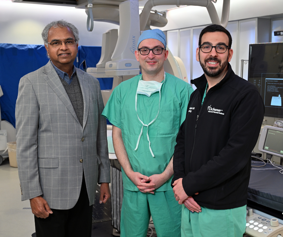 Interventional Cardiologist Vasanth Bethala, M.D.; Interventional Cardiologist Rami Kafa, M.D., who performed the procedure; and Cardiologist Samy Abdelghani, M.D., implanted the region’s first cardiac device in a patient’s heart in Slidell on Feb. 16, 2024.