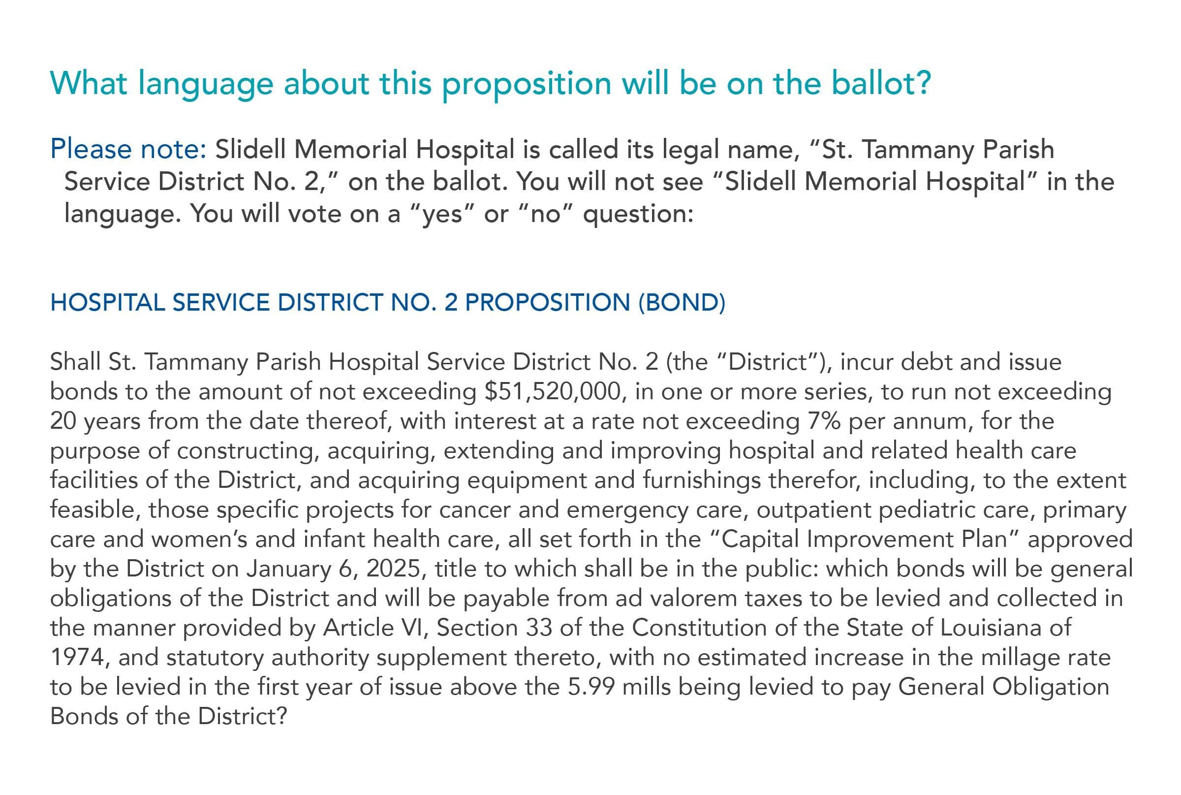 The proposed change will reduce the property tax designated for Slidell Memorial Hospital (SMH), lowering the annual tax for homeowners with a $250,000 property value from $118 to $105. This reduction will help enhance local healthcare services and technology, increase access to care, and attract top medical professionals. Additionally, it will strengthen SMH’s potential for future growth, benefiting the community in the long term.